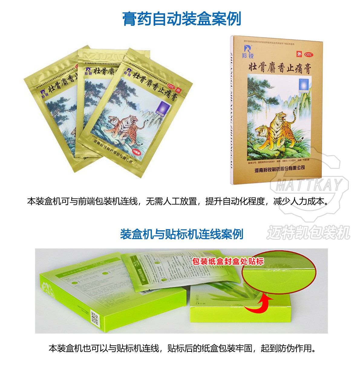 邁特凱膏藥裝盒機(jī)是一款專(zhuān)門(mén)為膏藥貼、退熱貼、面膜等片狀產(chǎn)品設(shè)計(jì)定制的自動(dòng)化紙盒包裝機(jī),本機(jī)具備自動(dòng)數(shù)片、自動(dòng)開(kāi)盒、裝盒、封盒等功能,用戶(hù)可根據(jù)需求加配袋裝機(jī)、貼標(biāo)機(jī)、噴碼機(jī)等。膏藥裝盒機(jī)包裝速度在10-100盒/分鐘內(nèi)可根據(jù)產(chǎn)品需求設(shè)置穩(wěn)定包裝速度,外觀采用優(yōu)質(zhì)鋼材及不銹鋼制造,可調(diào)節(jié)的紙盒槽機(jī)構(gòu),適應(yīng)包裝紙盒大小,手動(dòng)即可調(diào)節(jié),方便快捷。折盒進(jìn)料機(jī)構(gòu),設(shè)有無(wú)產(chǎn)品物料下紙盒,確保紙盒不會(huì)出現(xiàn)空物料包裝。
